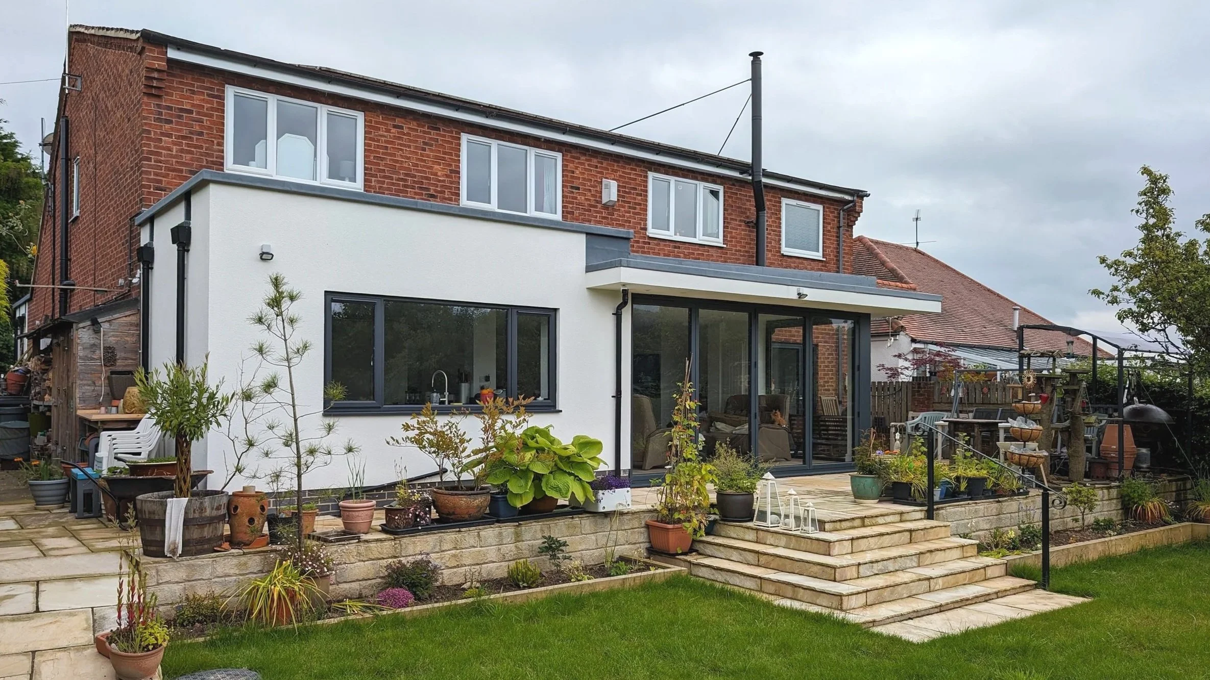 The finished home in Old Tupton is a masterclass in modern, inclusive design. The palette of white render and grey aluminium bi-folds acts as a clear contemporary intervention, marking the new additions as a bold architectural statement against the property's previous history.